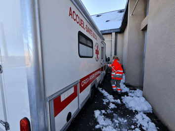 Le jeudi, 18 h 30 – Tout le monde est épuisé. Les visages sont tirés et marqués. Le remugle des produits désinfectants se dégage de l’arrière du véhicule. Le froid tétanise les membres de l’équipe médicale de la Croix-Rouge. La neige se met même à tomber. La journée terminée, les équipes de la Croix-Rouge sont prêtes à repartir.