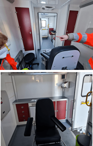 Infirmières, médecins et autres bénévoles sont donc fiers de le présenter. « Nous l’attendions avec impatience », s’exclame Sophie Boulet, l’infirmière en charge de la vaccination, en le contemplant, ce jeudi matin. « Il est à nos couleurs, bleu et rouge. Il est donc beau, n’est-ce pas ? », plaisante Annick, une de ses collègues, après lui avoir asséné une petite tape amicale sur l’épaule. « Il est énorme ! J’avais décidé de le conduire mais en montant, je me rends compte que je n’arrive pas jusqu’aux pédales », ajoute encore le médecin pédiatre Castagnier, avant de glisser une petite anecdote : « Ça me rappelle quand j’étais médecin en Afrique, en Côte-D’Ivoire, et que je parcourais la brousse dans un bus pour prodiguer des soins aux enfants. »